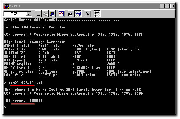 我们通过键盘敲入asm51 d:\001.txt后回车,如果出现00 Errors (0000)的话,表示汇编没有任何错误,成功了!