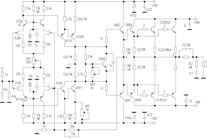 调试也很简单,调VR1使第一级负载电阻2.4kΩ上压降为6V,调VR2使中点为0V,调VR3使末级每管静态电流为100mA。中功率管A1209/C2911应安装散热器。本机在设置整体反馈电路时做过一个试验:将左声道电路的反馈点由A点引出,使之构成无大环路反馈功放,将右声道反馈点由B点引出,即所谓环路反馈功放,开机进行对比试听,可听出左声道音质要明显胜过右边声道,左声道声音极为通透纯净,瞬态响应很好,而右声道的声音则有点浑浊,解析力不高。这一试验相信对许多烧友有一定的参考价值。