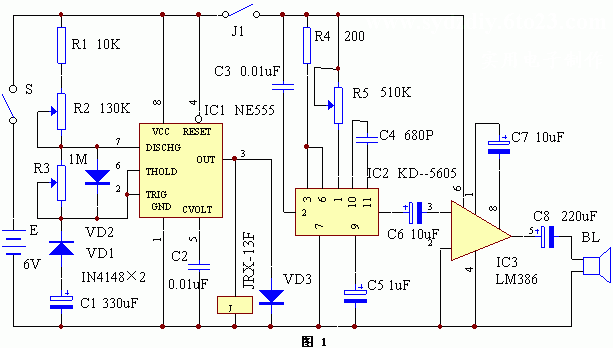 电路工作原理见1(点此下载原理图)。由时间控制电路、猫叫声发生电路、功率放大电路等组成。时间控制电路是由时基电路IC1 NE555及其外围阻容元件、二极管等组成。它是一个占空比可调的脉冲振荡器,其占空比由R2和R3控制。猫叫声发生电路由一块CMOS集成电路IC2 KD-5605担任,利用存贮技术将猫叫声固化在电路内部。功率放大器采用价廉物美的通用小功率音频放大集成电路IC3 LM386,它的特点是外围元件极少,电压范围宽,失真度小,装配简单。