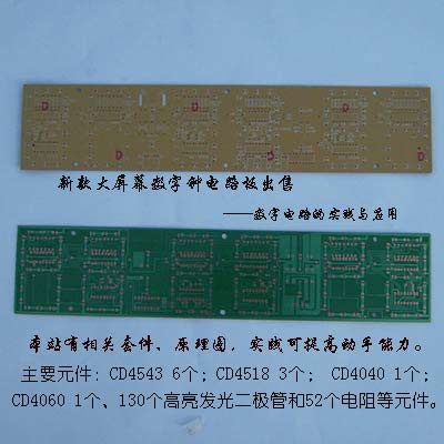 (说明:仅仅只有一块电路板,如没有元件者可找我们另行购买)说明:只有一块光电路板,只适合资深的电子爱好者,已经有其它的元件。这大屏幕数字电子钟套件中的一个配件。